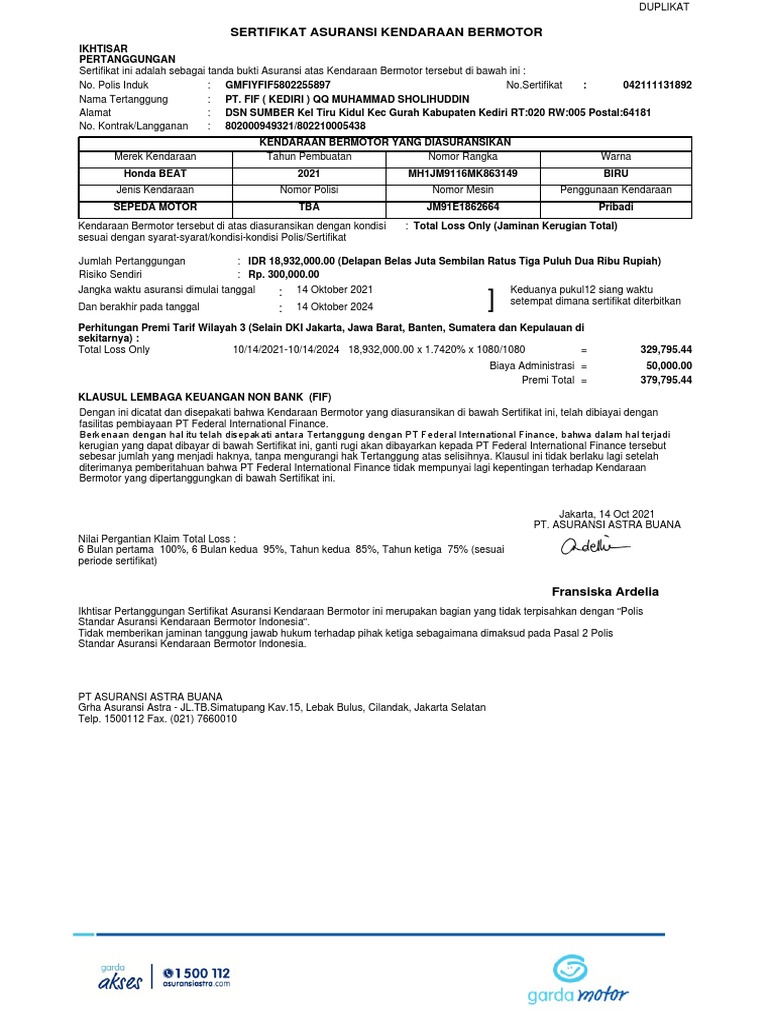 Read the content of PSAKBI (Polis Standar Asuransi Kendaraan Bermotor Indonesia or Indonesia Standard Automobile Insurance Policy) carefully.