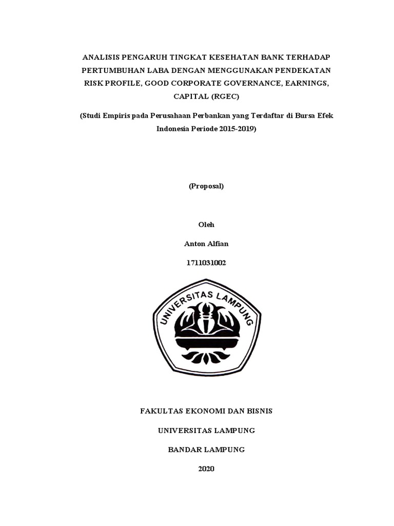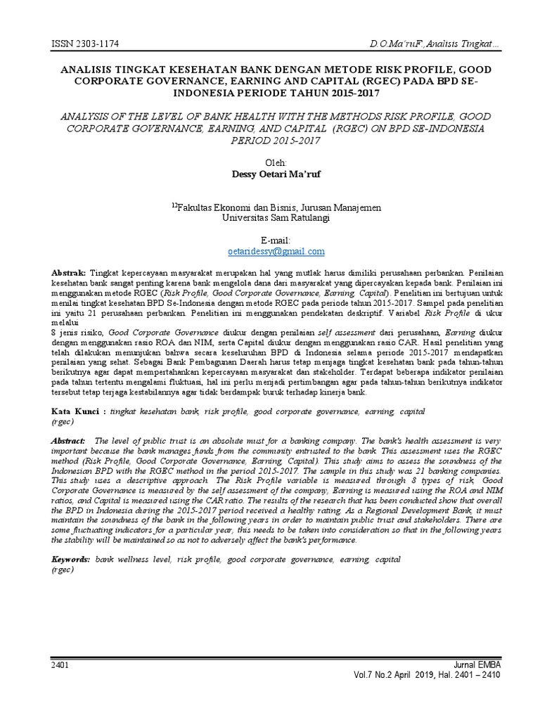 Analisis tingkat kesehatan bank dengan metode rgec. Teknik analisis data yang digunakan adalah analisis kesehatan bank dengan pendekatan Risiko ( Risk-based Bank Rating) dengan cakupan penilaian meliputi faktor-faktor RGEC . ANALISIS TINGKAT KESEHATAN BANK MENGGUNAKAN METODE RGEC (RISK PROFIL, GOOD CORPORATE GORVERNANCE, EARNING DAN CAPITAL) pada PT BNI SYARIAH SKRIPSI Disusu untuk Memenuhi Tugas dan Melengkapi Syarat Guna Memperoleh Gelar Sarjana Strata S.1 dalam Ilmu Perbank an Syariah SITI MALIYATULLOH NIM 1505036012 FAKULTAS EKONOMI DAN BISNIS ISLAM "Penilaian Tingkat Kesehatan Bank Dengan Metode Rgec Pada PT. Bank Mandiri (Persero), Tbk." E-Jurnal Manajemen Universitas Udayana, vol. 6, no. 2, 2017. Download citation file: RIS (Mendeley, Zotero, EndNote, RefWorks) BibTeX (LaTeX) Share Twitter Facebook Email ... ANALISIS TINGKAT KESEHATAN BANK DENGAN METODE RGEC (Risk Profile, Good Corporate Governance, Earning, and Capital) Pada PT Bank Syariah Bukopin Thn 2019 Diajukan untuk memenuhi tugas mata kuliah Analisis Keuangan dan Pasar Modal Yang diampu oleh Bapak Farid Firmansyah, SE., MM Disusun oleh : Indah Dian Mayasari 18383022085 PBS A PROGRAM STUDI PERBANKAN SYARIAH JURUSAN EKONOMI DAN BISNIS ISLAM ...
