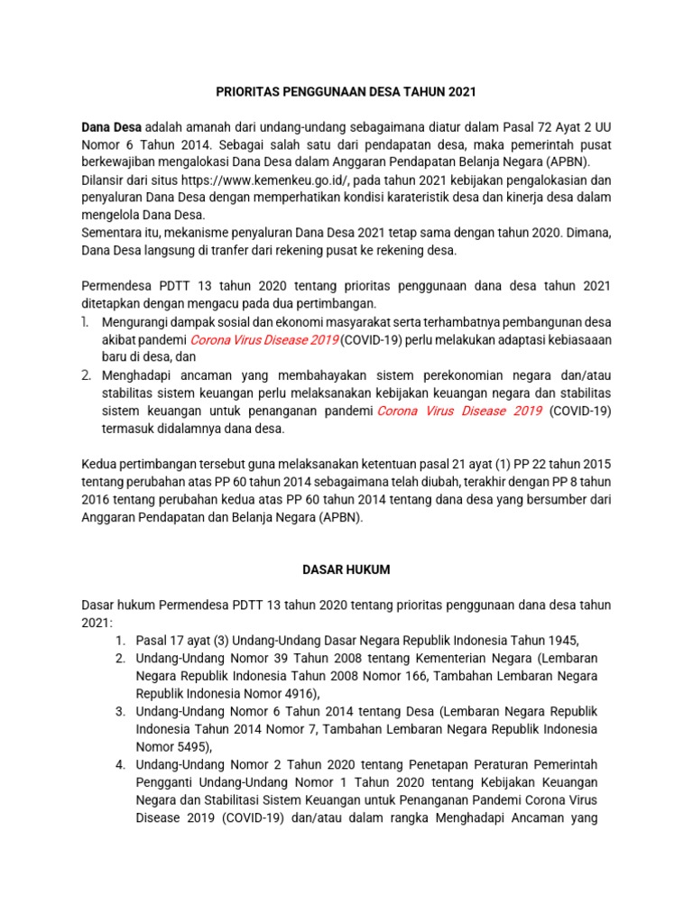 Penggunaan Dana Desa Tahun 2022 diprioritaskan untuk menjalankan ketentuan Undang-Undang Nomor 2 Tahun 2020 tentang Penetapan Peraturan Pemerintah Pengganti Undang-Undang Nomor 1 Tahun 2020 tentang Kebijakan Keuangan Negara dan Stabilitasi Sistem Keuangan untuk Penanganan Pandemi Corona Virus Disease 2019 (COVID-19) dan/atau dalam rangka ...