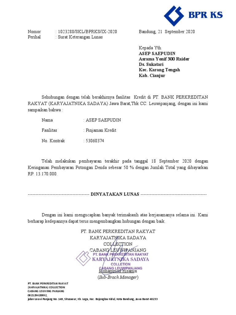 Surat keterangan lunas menjadi bukti kuat bahwa Sobat telah terbebas dari utang. Surat tersebut sebagai pegangan apabila suatu saat nanti terjadi permasalahan dengan pihak pemberi pinjaman. Misalkan, jika suatu saat ada masalah, sampaikan bukti surat keterangan lunas tersebut ke lembaga mediasi atau bahkan pengadilan karena posisi Sobat tetap ...
