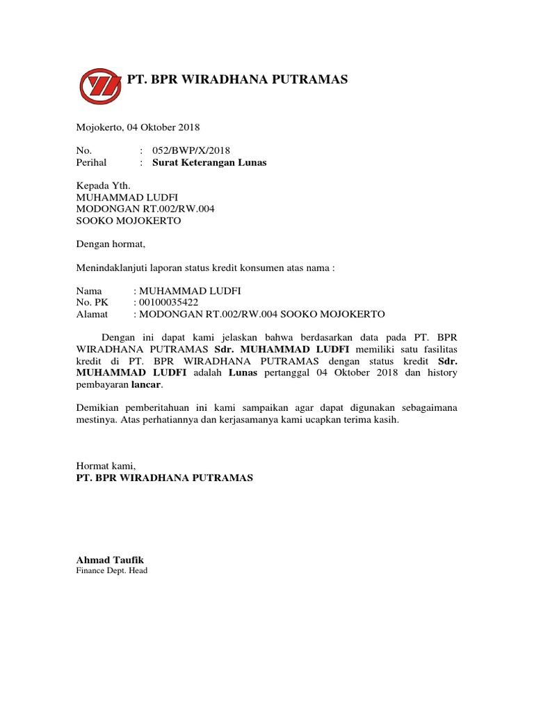 Contoh surat keterangan lunas hutang dari bank Namun jika sedang tidak memiliki uang atau sedang tidak cukup uang maka seseorang biasanya akan memilih untuk meminjam uang dari pihak lain baik itu pihak individu maupun dari bank dan lembaga keuangan lainnya. Contoh hal yang sering terjadi ketika mengajukan pinjaman disatu bank pas di bi checking ...