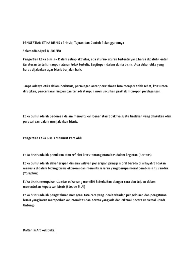 11 Nov 2021 — Pengertian Teori Etika Bisnis Menurut para Ahli · Yosephus, etika berbisnis adalah penerapan moral dalam bidang ekonomi, utamanya industri bisnis ... 31 Dec 2016 — Etika bisnis adalah suatu kode etik prilaku pengusaha bedasarkan nilai-nilai moral dan norma yang dijadikan tuntunan dalam membuat keputusan dan ... 13 Pengertian Etika Bisnis Menurut Para Ahli. Bisnis menjadi penggerak kegiatan ekonomi diseluruh dunia tanpa terkecuali. Tanpa kegiatan bisnis dunia tidak akan berjalan dan berkembang karena kebutuhan manusia tidak tercapai. Di dalam bisnis memang unik karena manusia cenderung menggunakan segala cara untuk meraih keuntungan.