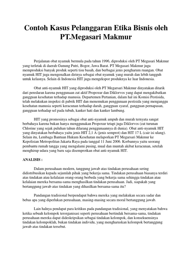 Contoh Kasus Pelanggaran Etika Bisnis di Dalam Negeri. PT. Megasari Makur adalah perusahaan yang memproduksi produk sepeti tisu basah, pengharum ruangan dan juga obat anti-nyamuk. Bermula pada tahun 1996, yang berproduksi di daerah Gunung Putri, Bogor, Jawa Barat. Obat anti-nyamuk yang diproduksi di beri merek HIT, HIT mengenalkan dirinya ...