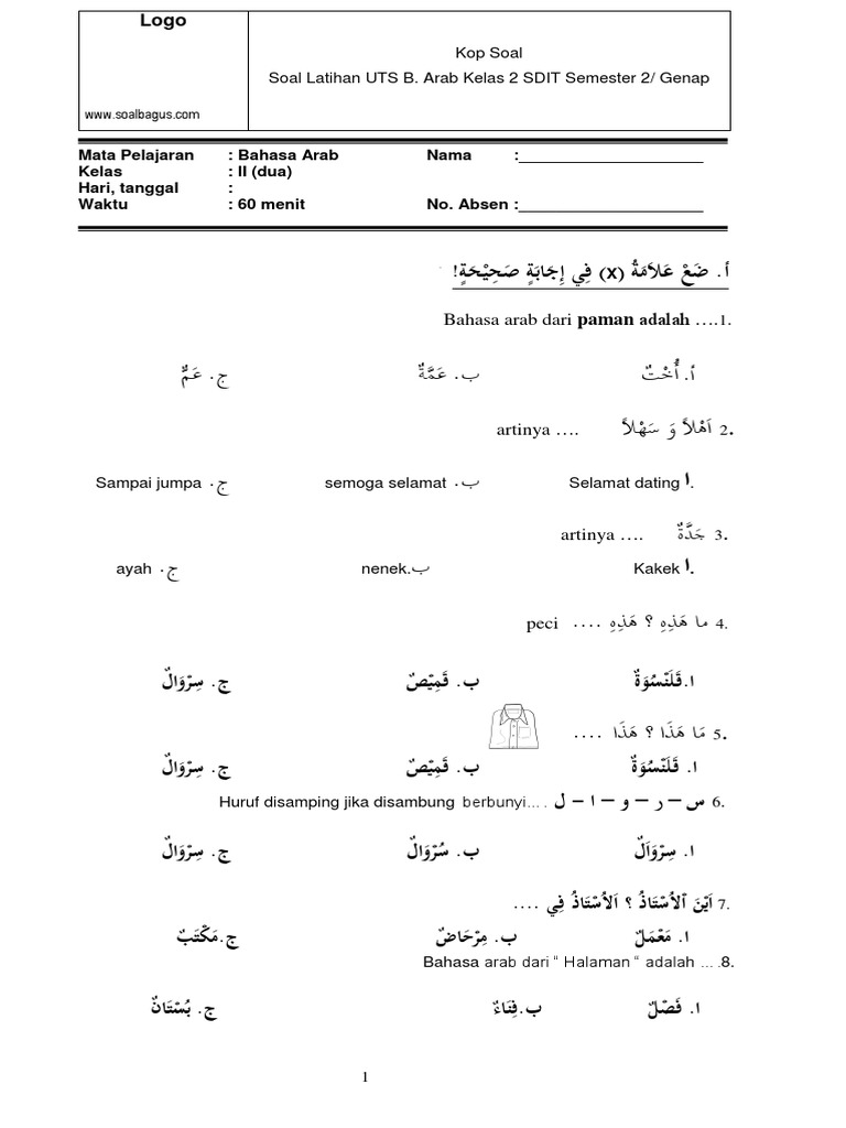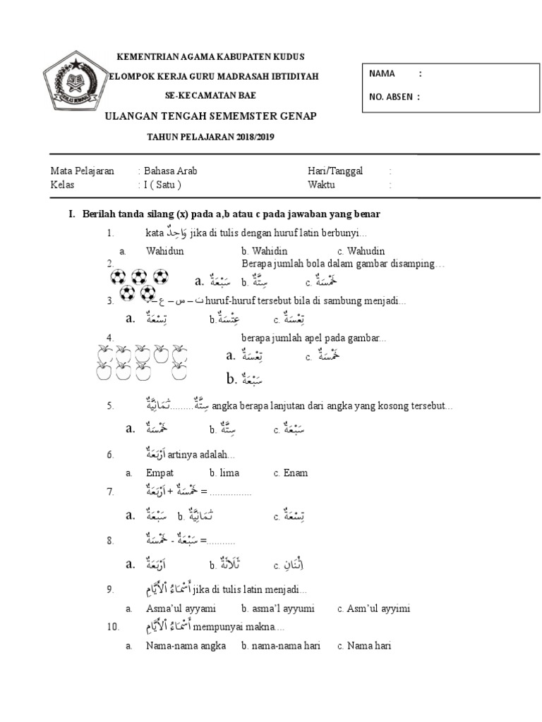 Sep 11, 2021 · Soal & Jawaban PTS Bahasa Arab MI 2021/2022 Semua Kelas, download Soal UTS Bahasa Arab Kelas I, II, III, IV, V, VI Semester 1 & 2 Sesuai KMA 183.