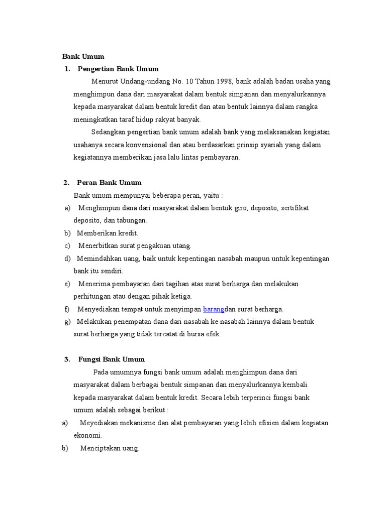 Fungsi dan Peranan Bank Umum Bank Perkreditan Rakyat dan Bank Sentral Bank adalah adalah sebuah lembaga intermediasi keuangan umumnya didirikan dengan kewenangan untuk menerima simpanan uang, meminjamkan uang, dan menerbitkan promes atau yang dikenal sebagai banknote.