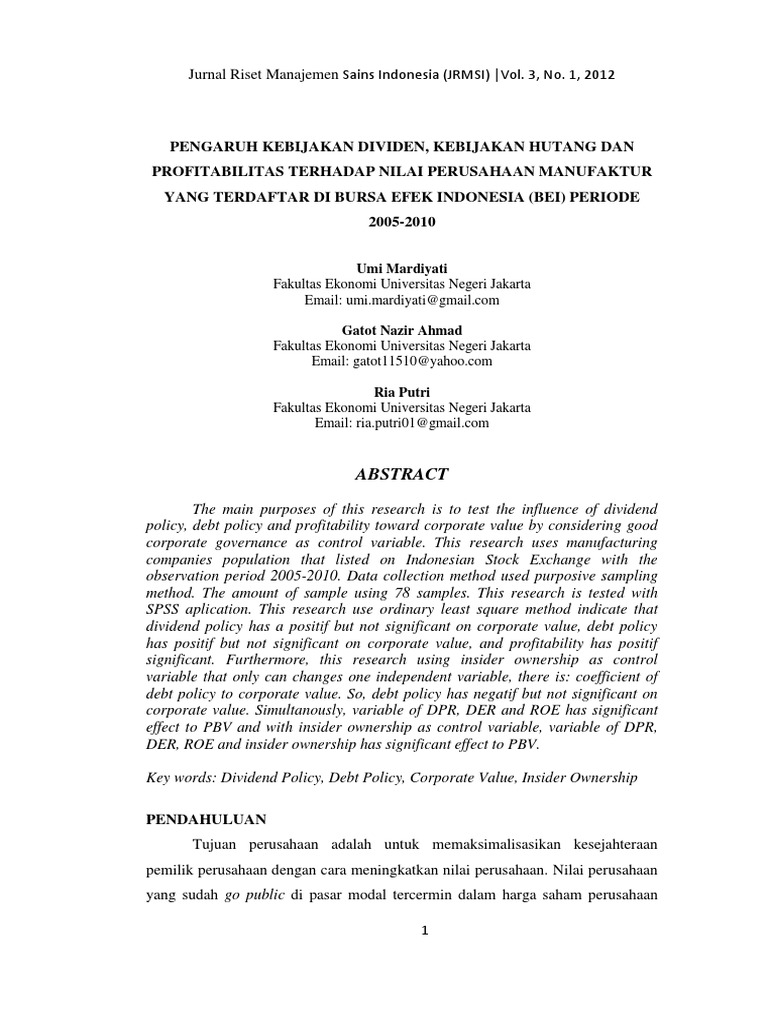 "Pengaruh Profitabilitas Dan Keputusan Investasi Terhadap Nilai Perusahaan Pulp & Paper Yang Terdaftar Di Bursa Efek Indonesia." Jurnal Online Mahasiswa Fakultas Ilmu Sosial dan Ilmu Politik Universitas Riau , vol. 4, no. 2, Oct. 2017, pp. 1-12. Metoda analisis data menggunakan regresi berganda. Hasil penelitian menunjukkan bahwa keputusan investasi berpengaruh positif terhadap nilai perusahaan. Meskipun demikian, keputusan pendanaan, kebijakan deviden dan ukuran perusahaan tidak berpengaruh terhadap nilai perusahaan. i PENGARUH KEPUTUSAN INVESTASI, KEBIJAKAN DEVIDEN, KEBIJAKAN HUTANG DAN PROFITABILITAS TERHADAP NILAI PERUSAHAAN (Studi Empiris pada Perusahaan Manufaktur yang Terdaftar di BEI Tahun 2010-2013) NASKAH PUBLIKASI "Pengaruh Keputusan Investasi, Keputusan Pendanaan, Dan Kebijakan Dividen Terhadap Nilai Perusahaan".Penyusunan skripsi ini dimaksudkan untuk memenuhi sebagian persyaratan akademis dalam menyelesaikan studi Program Sarjana S1 Jurusan Akuntansi Fakultas Ekonomi Universitas Diponegoro Semarang.