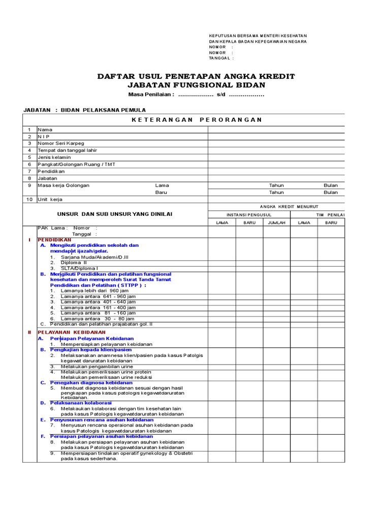 Angka kredit adalah satuan nilai dari tiap butir kegiatan dan/atau akumulasi butir-butir kegiatan yang harus dicapai oleh seorang Bidan dalam rangka pembinaan karier kepangkatan dan jabatannya. Tim penilai angka kredit adalah tim penilai yang dibentuk dan ditetapkan oleh pejabat yang berwenang dan bertugas menilai prestasi kerja Bidan. Angka Kredit Bidan Download : Pmk No 551 Ttg Petunjuk Teknis Jabatan Fungsional Bidan Dan Angka Kreditnya Pdf Document / Sesuai permenpan rb nomor 1 tahun 2008 tentang jabatan fungsional bidan dan angka kreditnya, tugas pokok bidan adalah melaksanakan pelayanan .. Selengkapnya dapat dilihat di permenpan no 01 tahun 2008 tentang jabatan ... Permenkes No 551 Tahun 2009 tentang Juknis Jabfung Bidan Dan Angka Kreditnya. Posted on June 30, 2016 by herodessolution. Bagi teman-teman bidan atau siapa saja yang membutuhkan file Permenkes No 551 Tahun 2009 tentang Juknis Jabfung Bidan Dan Angka Kreditnya dalam bentuk pdf dapat mengunduh ( Download) selengkapnya DISINI. Download * Klik pada nama file untuk melakukan pratinjau atau klik pada tombol download untuk mengunduh. Status. Mencabut : Permen PAN & RB No. 01/PER/M.PAN/1/2008 Tahun 2008 tentang Jabatan Fungsional Bidan dan Angka Kreditnya ...