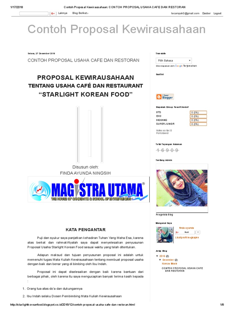 August 12, 2019 - Perencanaan bisnis adalah dokumen tertulis yang menjelaskan secara terperinci bagaimana suatu usaha bisa mencapai tujuan suatu... Contoh Bisnis Plan Cafe. Ringkasan bisnis plan. The Watertower adalah restoran / kafe layanan lengkap yang terletak di Distrik Sweet Auburn Atlanta. Restoran ini memiliki menu lengkap makanan "kenyamanan" dengan harga sedang yang dipengaruhi oleh tradisi memasak Afrika dan Prancis, tetapi berdasarkan resep waktu yang dihormati dari seluruh ... Mendirikan sebuah usaha tentu memerlukan perencanaan yang matang, termasuk di dalamnya pembuatan proposal bisnis. Berikut contoh proposal usaha makanan ringan berbahan dasar ketela, dengan nama produk S-tella. =====