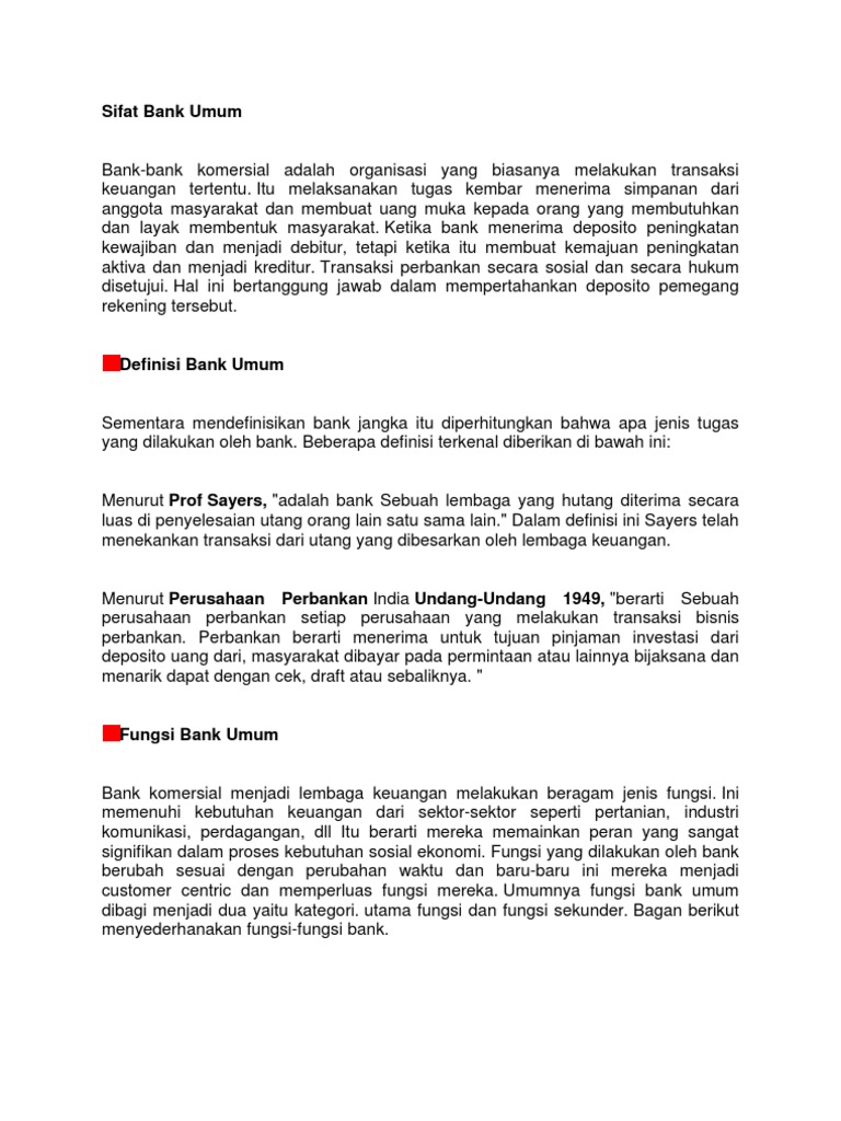 Fungsi bank umum adalah. Pengertian, Fungsi, Tugas dan Jenis - Jenis Bank Umum - Bank umum memiliki tugas dan fungsi serta tujuan yang menjadi aktivitas utama dari bank umum. Untuk lebih memahami tentang perbankan. A. Pengertian Bank Umum 1. Menurut Undang-Undang No. 10 tahun 1998, pengertian bank umum adalah bank yang melakukan kegiatan usaha secara konvensional atau berdasarkan prinsip […] Bank - Pengertian Menurut Para Ahli, Sejarah, Jenis, Tujuan Dan Fungsinya - DosenPendidikan.Com - Lantas apa yang dimaksud dengan Bank ?? Secara umum Pengertian Bank ialah suatu lembaga keuangan yang memiliki kewenangan untuk menghimpun dana dari masyarakat dan menyalurkannya kembali kepada masyarakat dalam bentuk pinjaman modal kerja untuk meningkatkan taraf hidup masyarakat umum. Fungsi bank umum. Berdasarkan Undang-undang Perbankan, berikut fungsi dari bank umum di antaranya: Menghimpun dana dari masyarakat. Kegiatan ini dilakukan dengan membuka berbagai produk tabungan, deposito, giro, atau bentuk simpanan lainnya. Baca juga: Simpanan Nasabah Kaya di Bank Makin Meningkat. Bank Umum adalah sebagai institusi yang berorientasi pada laba. Untuk mencapai tujuannya tersebut bank umum melaksanakan fungsi intermediasi. Karena bank umum diizinkan mengumpulkan dana berbentuk deposito, bank umum juga disebut sebagai lembaga keuangan deposito.