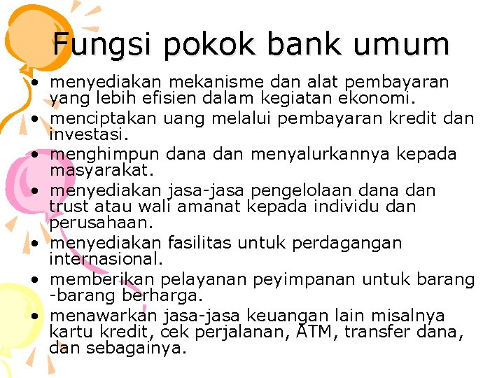 Secara umum, fungsi dari bank komersial atau bank umum dibagi menjadi tiga, antara lain: Agent of Trust (Agen Kepercayaan) Agent of Equity (Agen Ekuitas/Permodalan) Agent of Development (Agen Pembangunan) 4. Menciptakan uang giral. Ilustrasi uang (ANTARA FOTO/Oky Lukmansyah) Jika Bank Indonesia atau bank sentral menciptakan uang fiat, maka bank ...