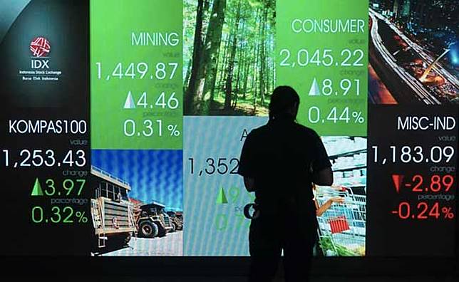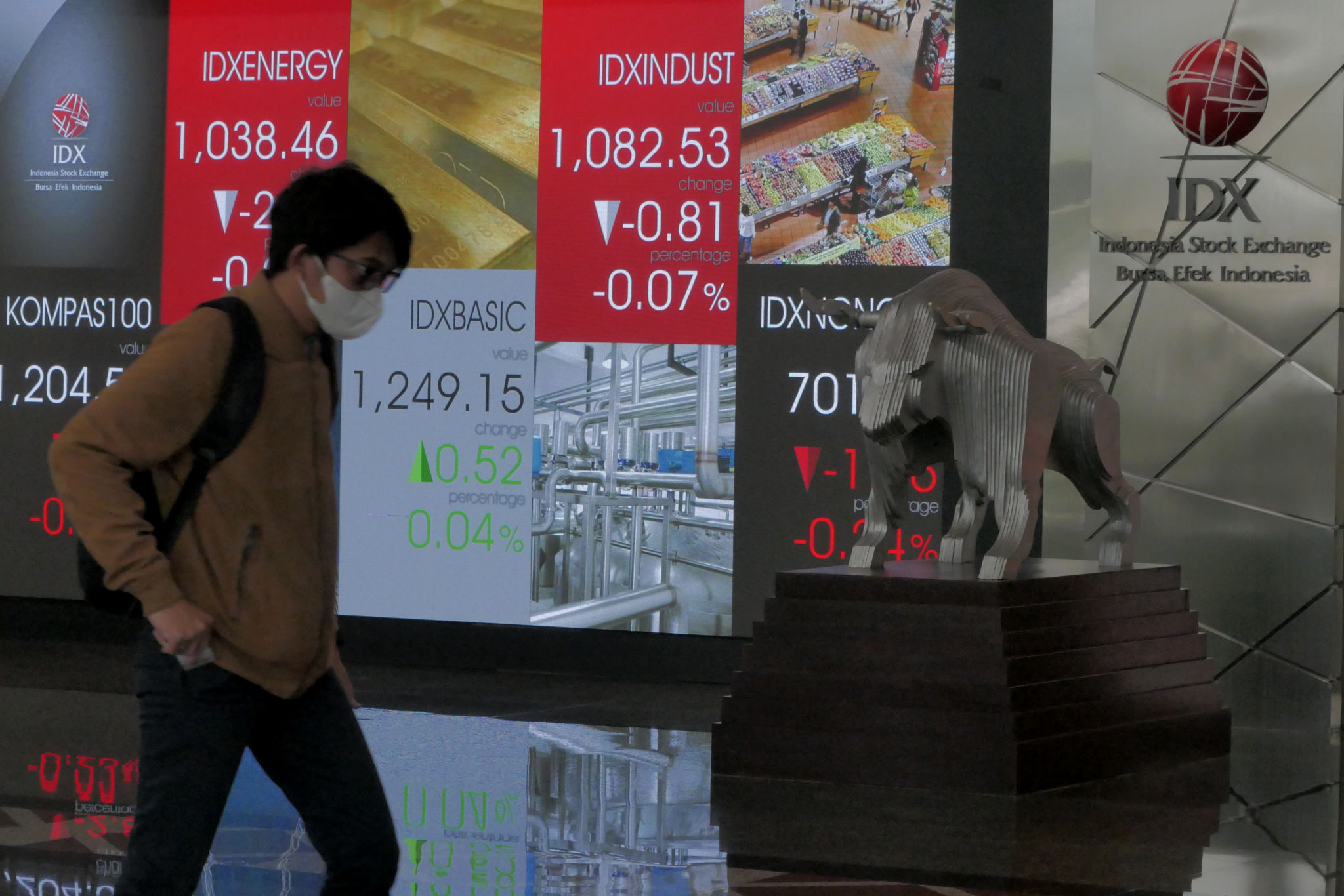 Pengunjung melintas di papan elektronik yang menampilkan pergerakan Indeks Harga Saham Gabungan (IHSG) di Bursa Efek Jakarta, Rabu (15/4/2020). Pergerakan IHSG berakhir turun tajam 1,71% atau 80,59 poin ke level 4.625,9 pada perdagangan hari ini.