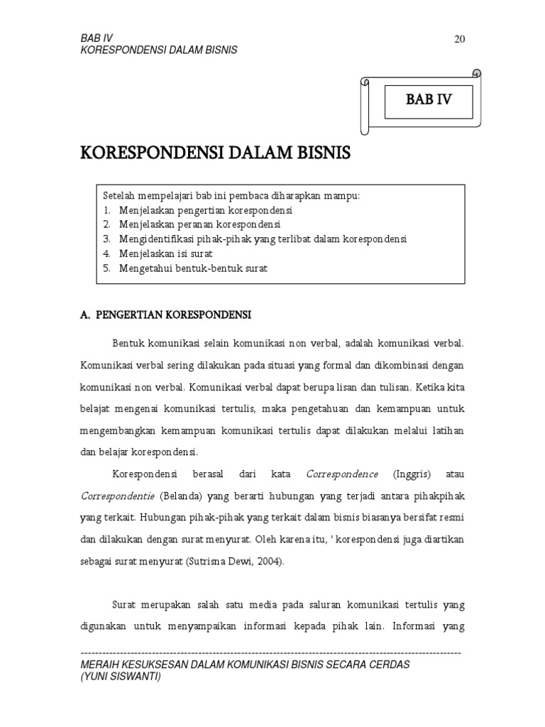 Kaitan korespondensi dengan kegiatan komunikasi bisnis. Korespondensi berasal dari kata correspondence inggris atau correspondentie belanda yang berarti hubungan yang terjadi antara pihak pihak yang terkaithubungan pihak pihak yang terkait dalam bisnsis biasanya bersifat resmi dan dilakukan dengan surat menyurat.