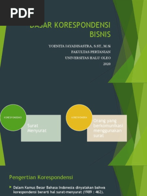 KORESPONDENSI BISNIS Kelompok Tujuh : Nurdayanti 43213110226 Ajeng Mas Reina 43213110232 Adhi Nugraha 43213110068 Sadam Husen 43213110121 • Korespodensi atau surat menyurat adalah salah satu bentuk komunikasi dengan mempergunakan surat sebagai alat, sedangkan dalam arti luas komunikasi merupakan proses penyampai pendapat, pesan atau lambang yang mengandung pengertian antar perseorangan atau ...