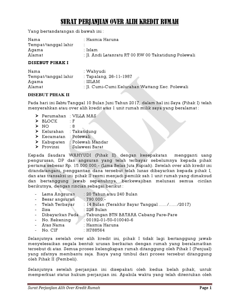 Surat Perjanjian Over Alih Kredit Rumah | PDF