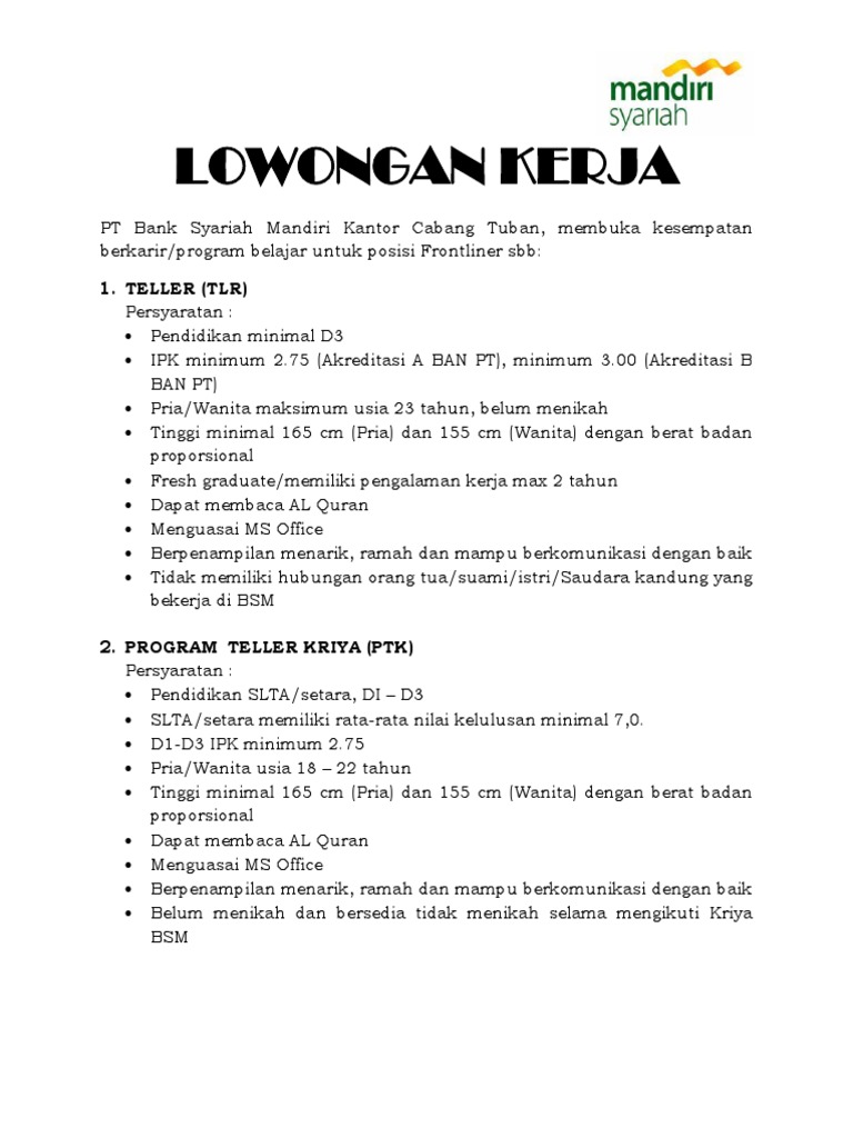 Lowongan bank syariah mandiri. Lowongan Kerja Bank BJB Syariah Tingkat D3 Bulan Maret ... Setelah melakukan pendaftaran Lowongan Kerja Bank BJB Syariah Tingkat D3 Bulan Maret 2022 sesuai dengan tata cara yang dijelaskan diatas kami sebagai redaksi berharap semoga anda dapat lolos seleksi penerimaan dan pada akhirnya menjadi salah satu pegawai diperusahaan atau instansi yang dimaksud.Tidak ada ucapan dan pembalasan yang kami harapkan dari anda selain bantuan saudara untuk dapat ... Cari Tahu Keuntungan dan Manfaat dari Fasilitas KPR Syariah Terlebih, saat ini pemberi fasilitas KPR syariah—Bank Syariah Indonesia—menawarkan margin bunga rendah setara 1,11 persen selama periode Februari-Maret 2022 dalam rangka merayakan hari jadinya yang pertama. Data dari Rumah.com Consumer Sentimet Study H1 2020 mendapati bahwa KPR syariah punya tren meningkat. RANS Entertainment Buka Lowongan Kerja, Ini Syarat dan ... Digital GridOto.com Bolasport.com Grid.id Kontan.co.id Kgmedia.id Otomatis Mode Gelap Mode Terang Login Berikan Masukanmu Langganan Kompas.id News Nasional Megapolitan Global Surat Pembaca Kilas Daerah Kilas Korporasi Kilas Kementerian Sorot Politik Kilas Badan Negara Kilas Parlemen Indeks Regional Medan... 4 Soft Skill yang Perlu Dimiliki Para Pekerja Oleh sebab itu, bagi kamu yang ingin mencari pekerjaan selama pandemi ini, perlu meng-update skill sesuai dengan yang dibutuhkan perusahaan. HR Director of Blue Bird Group Pambudi Sunarsihanto mengatakan, salah satu skill yang harus dimiliki pekerja adalah komunikasi yang baik. Ia menjelaskan dalam berkomunikasi yang baik mencakup kemampuan ...