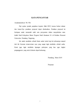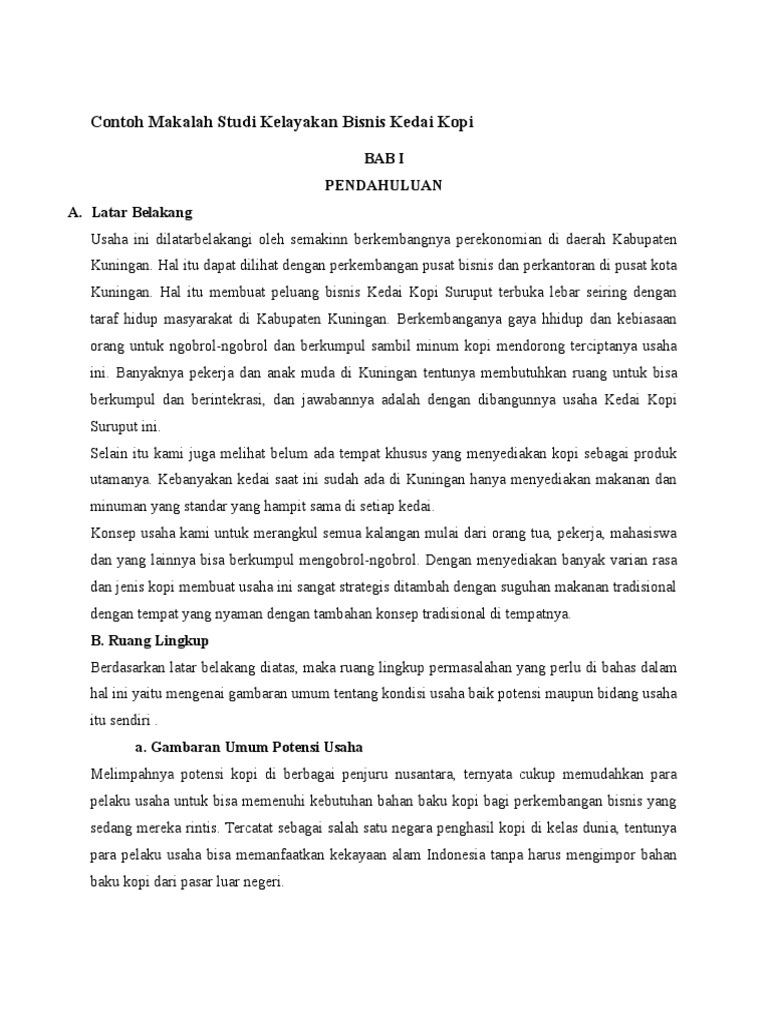 Studi Kelayakan Bisnis: "Proposal Usaha Cafe KO KO BOP LUV" BAB I. PENDAHULUAN. 1.1 Latar Belakang. Melihat perkembangan zaman dan lingkungan, maka orang sekarang mulai berhati-hati dalam memilih dan membeli sesuatu. Ditambah berkembangnya budaya Korea dan Kpop yang mendunia sekarang... Contoh Proposal Studi Kelayakan Bisnis Usaha Cafe Jan 08, 2019 · Itulah yang dapat admin bagikan mengenai contoh proposal studi kelayakan bisnis usaha cafe. Admin blog Berbagi Contoh Proposal 2019 juga mengumpulkan gambar-gambar lainnya terkait contoh proposal studi kelayakan bisnis usaha cafe dibawah ini.