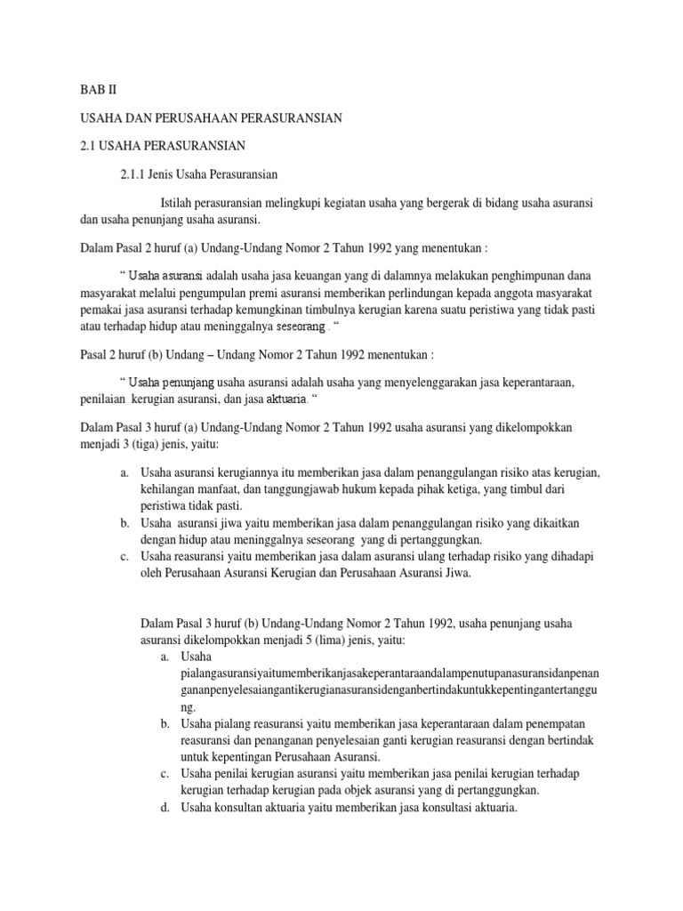 Undang-undang Nomor 2 Tahun 1992 tentang Usaha Perasuransian Asuransi. Undang-Undang. Undang-undang Nomor 2 Tahun 1992 tentang Usaha Perasuransian; Lists; Recent; Otoritas Jasa Keuangan. About OJK. Vision and Mission; Commissioner Board ; ... Undang-undang Nomor 2 Tahun 1992 tentang Usaha Perasuransian. Feb 11 1992 uu292_1389086128.pdf BAB I Ketentuan Umum. Memberikan penjelasan mengenai definisi dan ...