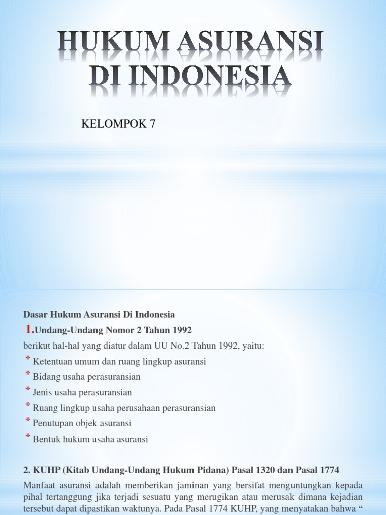 Penjelasan Undang-undang Republik Indonesia Nomor 2 Tahun ... UNDANG-UNDANG REPUBLIK INDONESIA NOMOR 2 TAHUN 1992. TENTANG USAHA PERASURANSIAN. I. UMUM. ... pembinaan dan pengawasan terhadap Program Asuransi Sosial dilakukan oleh Menteri teknis yang bersangkutan berdasarkan Undang- undang yang mengatur Program Asuransi Sosial dimaksud. ... PDF A. Asuransi 1. - uinsby.ac.id 2. Dasar Hukum Asuransi Berikut 5 dasar hukum asuransi yang berlaku di Indonesia, yaitu: Undang-Undang Nomor 2 Tahun 1992 Undang-Undang Nomor 2 Tahun 1992 merupakan dasar hukum utama yang mengatur dan menentukan segala kegiatan asuransi. Melihat isi dari UU No.2 Tahun 1992, didalamnya memuat peraturan tentang usaha perasuransian. b. (DOC) Sekadar Perbandingan UU No. 40 Tahun 2014 tentang ... Secara umum, terdapat banyak perbedaan antara Undang-Undang Nomor 40 Tahun 2014 dengan Undang-Undang Nomor 2 Tahun 1992. Banyak ketentuan di undang-undang asuransi yang baru yang sebelumnya tidak diatur oleh undang-undang asuransi yang lama. UU No. 40 Tahun 2014 memiliki 92 pasal yang terbagi dalam 18 bab. Hukum asuransi Undang-Undang No 2 Tahun 1992 dalam uu no 2 tahun 1992 disebutkan bahwa asuransi atau pertanggungan adalah perjanjian yang terjadi antara dua belah pihak atau lebih, dimana pihak penanggung mengikatkan diri kepada pihak tertanggung dengan cara menerima sejumlah premi asuransi untuk memberikan layanan penggantian kepada tertanggung akibat terjadinya suatu peristiwa yang tidak …