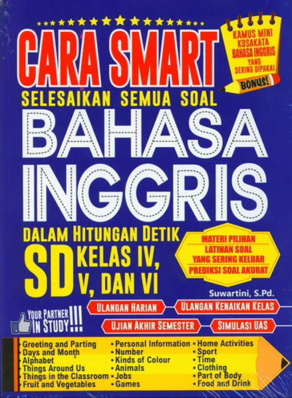 Soal Bahasa Inggris Kelas 1 Semester 1 & 2 (Lengkap) Baca Juga: Soal Bahasa Inggris Kelas 4. Dari berbagai soal bahasa Inggris kelas 1 di atas, kamu bisa lihat ada hal-hal tertentu yang perlu dikuasai. Selain alfabet, kamu juga harus mengetahui benda-benda yang ada di sekitarmu terutama di rumah. Di samping berbagai benda, mulailah mengeksplor kosakata lain seperti fruit dan animal.