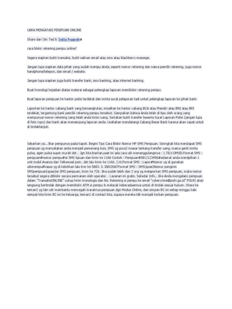 hot.liputan6.com › read › 46491228 Cara Melaporkan Penipuan Online, Laporkan ke Polisi Hingga ... Sep 03, 2021 · Cara melaporkan penipuan online yang selanjutnya adalah melaporkannya langsung ke kantor polisi. Berikut langkah-langkah melaporkan penipuan online ke kantor polisi: 1. Siapkan bukti yang cukup dan akurat. Siapkan bukti-bukti penipuan online. Bukti ini seperti tangkapan layar, url, foto, rekaman suara, atau video. Apes Kena Tipu? Ini Cara Blokir Rekening Penipu Online Simak cara cek rekening penipuan, cara blokir rekening penipu online di bawah ini. 1. Langsung telepon bank sebagai cara melaporkan rekening penipu. Begitu sadar jadi korban penipuan online, langsung telepon bank yang kita pakai buat transfer. Setelah kita menelepon dan menjelaskan perihal penipuan itu, bank akan segera membekukan dana yang ... Cara Melaporkan Penipuan Transfer Bank, Mudah Tanpa Ribet 1. Menggunakan cekrekening.id Cara melaporkan penipuan online berkedok transfer bank yang pertama adalah dengan cek no rekening penipu tersebut memanfaatkan website cekrekening.id, dengan menggunakan website cekrekening.id Anda dapat memeriksa kredibilitas dari rekening tersebut. Cara Cepat Melaporkan Penipuan Transaksi Online Dan SMS ... Langkah Proaktif Melaporkan SMS Penipuan. Masyarakat harus proaktif melakukan upaya penanggulangan modus operandi penipuan tersebut dengan melaporkan kepada operator, agar segera di blokir karena jika lebih 2 orang pelapor, maka pihak operator segera melakukan blokir secara permanen. Caranya. 1.