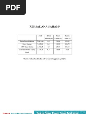 Panin Dana Unggulan - panin-am.co.id Panin Dana Unggulan Subscription. Tidak dikenakan biaya Pembelian; Minimal investasi awal Rp 500.000,-Minimal investasi Top-Up Rp 250.000,-Redemption. Tidak dikenakan biaya Penjualan; Minimal Penjualan Rp 100.000,-Saldo Minimum Kepemilikan Unit Penyertaan Rp 250.000,- 10 Reksadana Terbaik Return Tertinggi 5 Tahun Terakhir ... Berikut ini adalah produk reksadana saham yang mampu mengungguli pertumbuhan IHSG selama 5 tahun terakhir: Panin Dana Maksima. Panin Dana Prima. MNC Dana Ekuitas. Schroder Dana Prestasi. Millenium Danatama Equity. Schroder Dana Istimewa. BNP Paribas Pesona Syariah. Cipta Syariah Equity. Batavia Dana Saham Optimal.