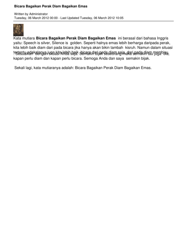Diam Itu Emas - Zona Belajar Kimia - WordPress.com Peribahasa "diam itu emas" tidak hanya dikenal di negara kita atau di Inggris. Beberapa waktu yang lalu, ketika saya berkunjung ke Maroko untuk menghadiri suatu diskusi keagamaan, peribahasa tersebut saya dengar juga: "Diam itu emas dan bicara itu perak." Tanpa menelusuri dari mana asal muasal peribahasa tersebut, yang jelas, makna dan arah yang ditujunya sejalan dengan tuntunan agama.