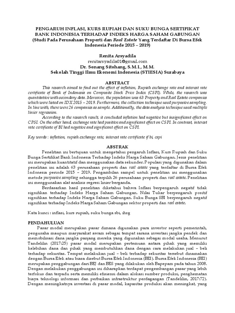 PDF Pengaruh Inflasi, Suku Bunga Sbi, Dan Kurs Mata Uang ... Tujuan dari penelitian ini adalah untuk mengetahui pengaruh inflasi, suku bunga sbi, dan kurs IDR/USD terhadap indeks harga saham gabungan periode 2016-2020. Populasi yang digunakan dalam penelitian ini adalah data tentang Inflasi, Suku Bunga SBI, Kurs (Rupiah terhadap Dollar AS). Kemudian, sampel