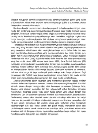 Pengaruh Nilai Tukar Rupiah (Kurs) Terhadap Harga Saham (skripsi dan ... Pengaruh nilai tukar terhadap harga saham menurut Eduardus Tandelilin (2010:344) adalah sebagai berikut: "Nilai tukar merupakan sinyal positif, artinya bila nilai tukar terapresiasi maka harga saham akan meningkat begitu juga sebaliknya apabila nilai tukar mengalami depresiasi maka harga saham akan mengalami penurunan". PDF Pengaruh Suku Bunga Dan Nilai Tukar Terhadap Harga Saham Perusahaan ... Perubahan nilai tukar mempunyai pengaruh negatif terhadap harga saham. Artinya apabila nilai mata uang asing naik maka harga saham akan turun, hal disebabkan harga mata uang asing yang tinggi perdagangan di bursa efek akan semakin lesu, karena tingginya nilai mata uang mendorong investor berinvestasi di pasar uang. Pengaruh Nilai Tukar Rupiah Dan Harga Emas Terhadap Indeks Harga Saham ... Nilai tukar merupakan variabel makro ekonomi yang mempengaruhi harga saham. Nilai tukar rupiah adalah harga rupiah terhadap mata uang Negara lain. Jadi, nilai tukar rupiah/US$ merupakan nilai dari satu mata rupiah yang ditranslasikan ke dalam mata uang dolar AS. Kurs inilah sebagai salah satu indikator yang mempengaruhi aktivitas Pengaruh Nilai Tukar Rupiah Terhadap Harga Saham - PSYCHOLOGYMANIA Pengaruh nilai tukar rupiah terhadap harga saham sangat besar. Salah satu faktor yang mempengaruhi harga saham adalah perubahan nilai tukar rupiah dalam negeri. Perubahan nilai tukar dalam negeri yang relatif tajam akan mempengaruhi kepercayaan investor untuk menanamkan dananya di dalam negeri dalam bentuk pembelian saham-saham di pasar modal.