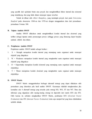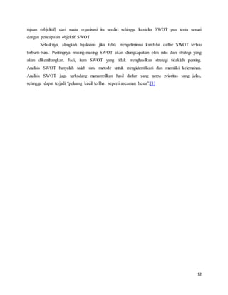 PDF Analisis Swot Untuk Meningkatkan Kualitas Pelayanan Pada ... analisis swot merupakan analisis terhadap empat faktor yang lazim digunakan oleh suatu institusi atau perusahaan, antara lain kekuatan (strength), kelemahan (weakness), peluang (opportunity) dan ancaman (threat).5kekuatan dapat menjadi sumber potensial yang dapat di manfaatkan menjadi sebuah keunggulan bagi perusahaan dan kelemahan …