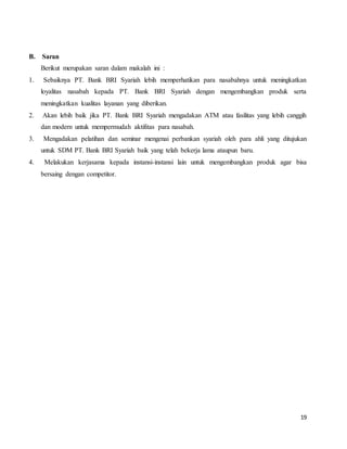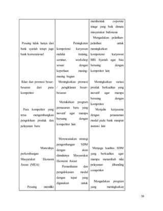 Company Review: Bank BRI - Kelompok Studi Pasar Modal ... Bank Rakyat Indonesia (BRI)Dari analisa kredit swot yang menggambarkan situasi dan kondisi yangdihadapi oleh BRI, maka strategi yang harus dijalan oleh BRI adalah: Ekspansi pinjaman dengan focus pada pembiayaan UKMK dengan perbaikan feature produk dan kemudahan akses layanan kredit PDF Analisis Swot Terhadap Produk Tabungan Di Bank Rakyat ... ANALISIS SWOT TERHADAP PRODUK TABUNGAN DI BANK RAKYAT INDONESIA SYARIAH KANTOR CABANG PEMBANTU BANYUMAS AJIBARANG (Studi Kasus Pada Produk Tabungan Faedah, Tabungan Haji, dan Tabungan Karyawan iB BRISyariah) Analisis Swot Pada Produk Tabungan Impian Di Bank Bri ... ERI KHOERIYAH, SITI (2019) ANALISIS SWOT PADA PRODUK TABUNGAN IMPIAN DI BANK BRI SYARIAH KC TASIKMALAYA. Sarjana thesis, Universitas Siliwangi. (Pdf) Analisa Swot Pada Tabungan Bank Bri Dan Mandiri ... ANALISA SWOT PADA TABUNGAN BANK BRI DAN MANDIRI OLEH MUHAMAD ARZAN A. Latar belakang B. Rumusan Masalah Bank merupakan salah satu lembaga keuangan Dari uraian latar belakang yang singkat diatas kami yang memiliki peran penting dalam perekonomian identifikasikan rumusan masalah sebagai berikut: suatu negara, karena jasa jasanya merupakan 1.