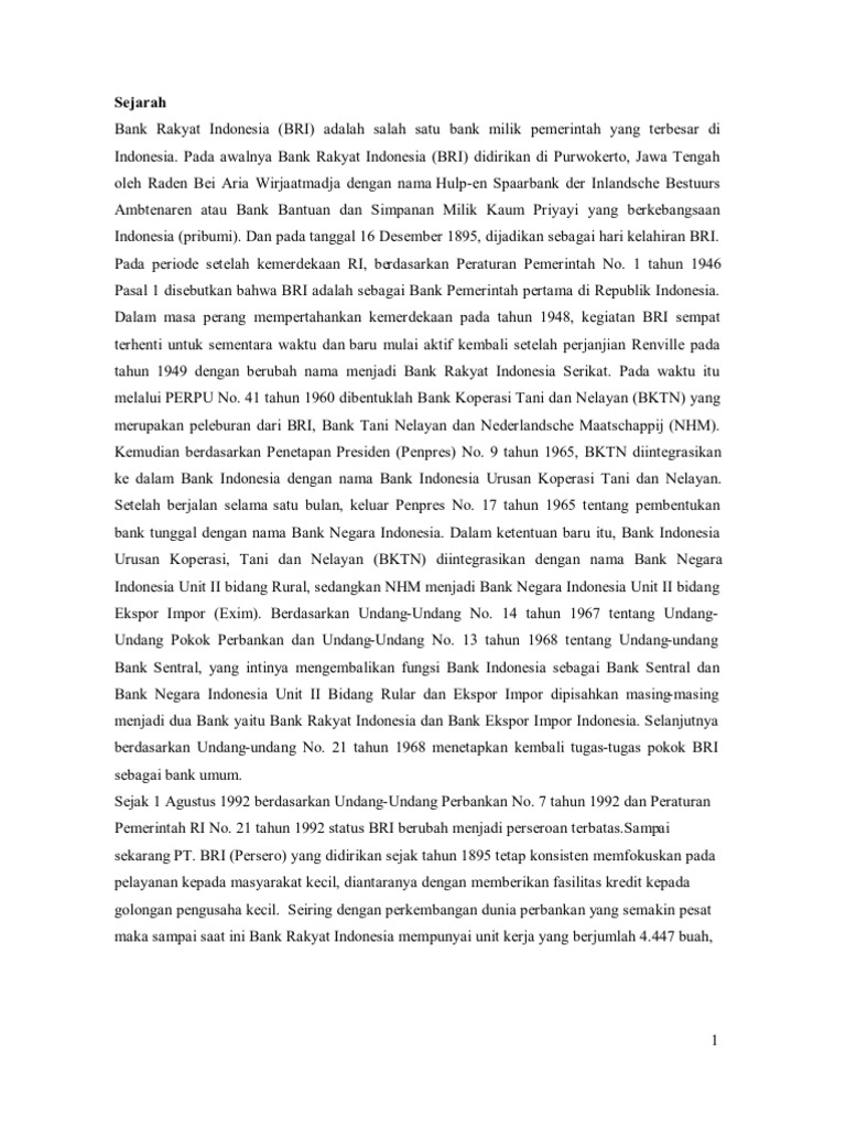 Swot Bank Bri | PDF - Scribd Analisis Swot Bank Bri Unduh sekarang Lompat ke Halaman Anda di halaman 1dari 8 Cari di dalam dokumen Tugas Manajemen Stratejik Posted on May 11, 2014 LATAR BELAKANG, STRATEGI, dan TAKTIK PERUSAHAAN Bank Rakyat Indonesia (BRI) adalah salah satu bank milik pemerintah yang terbesar di Indonesia.