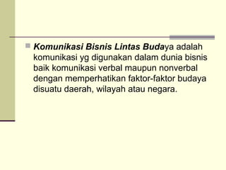 Makalah Komunikasi Bisnis Tentang Urgency Komunikasi ... Komunikasi bisnis lintas budaya adalah komunikasi yang digunakan dalam dunia bisnis baik komunikasi verbal maupun nonverbal dengan memperhatikan faktor-faktor budaya di suatu daerah, wilayah, atau negara. Pengertian lintas budaya dalam hal ini bukanlah semata-mata budaya asing (internasional), tetapi juga budaya yang tumbuh dan berkembang di ...