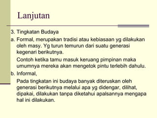 KOmunikasi bisnis lintas budaya by Amel Talitha Contoh-contoh berkomunikasi antar budaya Dalam suatu kelompok bahasa terdapat perbedaan seperti dialek, makna yang diberikan pada gerakan tubuh 2. Pakaian dan Penampilan * Kimono - orang jepang Komunikasi Antar Budaya * Wajah yang dicoret - suku indian 4. Waktu dan Kesadaran akan waktu * Tepat waktu - orang jerman Lebih santai - orang Amerika Latin
