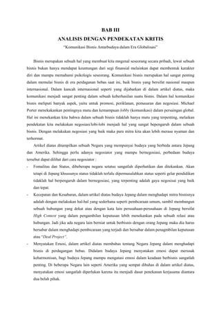 KOMUNIKASI BISNIS LINTAS BUDAYA | Komunikasi Bisnis dan Budaya A. Pengertian Komunikasi Bisnis Lintas Budaya. Komunikasi bisnis lintas budaya adalah komunikasi yang digunakan dalam dunia bisnis baik komunikasi verbal maupun nonverbal dengan memperhatikan faktor-faktor budaya di suatu daerah, wilayah atau negara. Apabila para pelaku bisnis akan melakukan ekspansi bisnisnya ke daerah lain atau ke negara lain ... makalah bisnis komunikasi lintas budaya - Blogger Komunikasi bisnis lintas budaya adalah komunikasi yang digunakan dalam dunia bisnis baik komunikasi verbal maupun nonverbal dengan memperhatikan faktor budaya di suatu daerah, wilayah, atau negara. KOMUNIKASI BISNIS LINTAS BUDAYA - windasirumapea Komunikasi bisnis lintas budaya adalah komunikasi yang digunakan dalam dunia bisnis baik komunikasi verbal maupun nonverbal dengan memperhatikan faktor-faktor budaya di suatu daerah, wilayah, atau negara. 4 Mengapa komunikasi bisnis lintas budaya menjadi penting ... 4. Mengapa komunikasi bisnis lintas budaya menjadi penting artinya bagi para pelaku bisnis terutama yang berorientasi ekspor ? Jawab : Dengan melihat perkembangan atau tren yang saat ini, komuniaksi bisnis lintas budaya menjadi sangat penting artinya bagi terjalinnya harmonisasi bisnis di antara mereka. Bagaimanapun diperlukan suatu pemahaman bersama antara dua orang atau lebih dalam melakukan ...