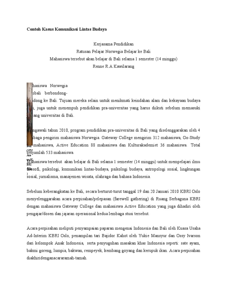 Artikel Komunikasi Lintas Budaya Bagi para pelaku bisnis , pemahaman yang baik terhadap budaya di suatu daerah wilayah atau negara menjadi sangat penting artinya bagi pencapaian tujuan organisasi bisnis. secara sederhana, komunikasi bisnis lintas budaya adalah komunikasi yang digunakan dalam dunia bisnis baik komunikasi verbal maupun nonverbal dengan memperhatikan faktor-faktor budaya di suatu daera, wilayah, atau negara. 43 contoh kasus komunikasi bisnis lintas budaya - Info ... Komunikasi bisnis lintas budaya. Diterbitkan oleh Dione Surya Telah diubah "6 tahun yang lalu. 6 Contoh: Kampus tidak memperkenankan mahasiswa untuk menggunakan sandal lanjutan Formal Informal Teknis Teknis Pada tingkat ini, aturan yang mengikat secara formal sudah diterapkan. Etnosentrisme dan Komunikasi Lintas Budaya - Kompasiana.com Dengan memandang budaya sendiri lebih unggul dan budaya lainnya yang asing sebagai budaya 'yang salah', maka komunikasi lintas budaya yang efektif hanyalah angan-angan karena akan cenderung lebih mebatasi komunikasi yang di lakukan dan sebisa mungkin tidak terlibat dengan budaya asing yang berbeda atau bertentangan dengan budaya sendiri.