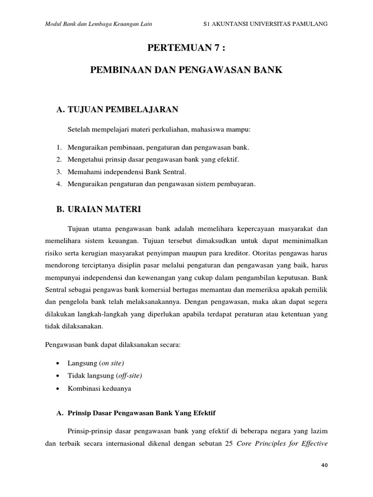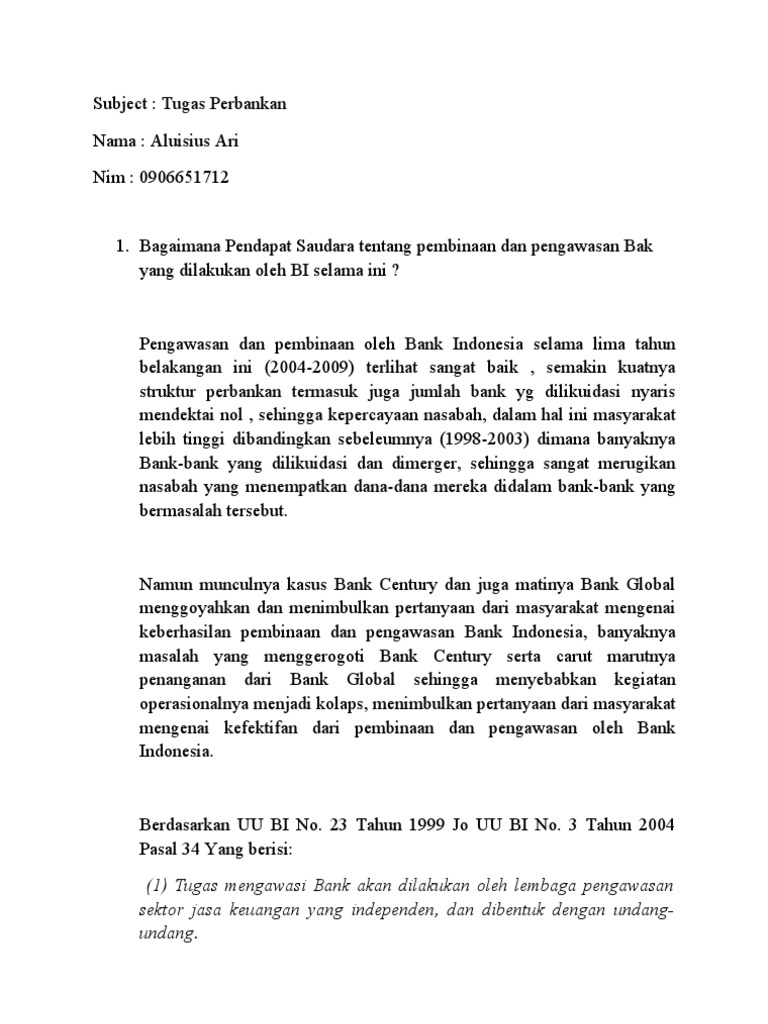 PEMBINAAN & PENGAWASAN PERBANKAN - ELIB UNIKOM PEMBINAAN & PENGAWASAN PERBANKAN Pertemuan VII. Disampaikan Oleh: Budi F. S, SH., MH. PEMBINAAN & PENGAWASAN OLEH BANK INDONESIA. Pembinaan dan Pengawasan Bank - Ensikloblogia Pembinaan dan pengawasan bank ini juga ditujukan untuk kepentingan dan kemajuan bank itu sendiri agar jangan menderita kerugian di samping kepentingan nasional. Pembinaan dan pengawasan bank yang dijalankan harus tetap konsisten agar dalam pelaksanaan di lapangan tidak terjadi hal-hal yang tidak diinginkan. Tweet Aspek Hukum Pengawasan Perbankan Syariah oleh OJK 1. Pengertian Otoritas Jasa Keuangan Sesuai dengan amanat Pasal 34 Undang-Undang Nomor 23 Tahun 1999 tentang Bank Indonesia, dipersyaratkan pembentukan suatu lembaga pengawasan sektor jasa keuangan yang baru dan independen yang dibentuk dengan Undang-Undang.Sebagai perwujudan pasal tersebut, dibentuklah Otoritas Jasa Keuangan (OJK) melalui Undang-Undang Nomor 21 Tahun 2011 tentang Otoritas ... Kewenangan Pengawasan Bank Indonesia - Klinik Hukumonline Pengawasan langsung dapat berupa pemeriksaan umum dan pemeriksaan khusus,yang bertujuan untuk mendapatkan gambaran tentang keadaan keuangan bank dan untuk memantau tingkat kepatuhan bank terhadap peraturan yang berlaku serta untuk mengetahui apakah terdapat praktik-praktik yang tidak sehat yang membahayakan kelangsungan usaha bank.