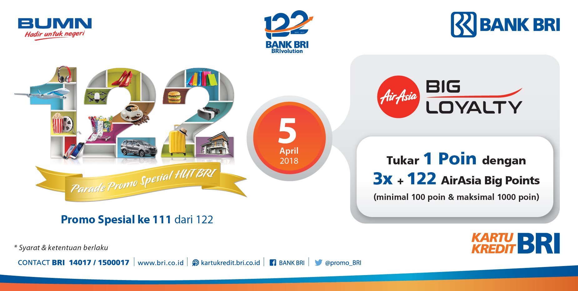 Tukar BRI Point dengan 3x GarudaMiles | Promo Kartu Kredit ... Tukar BRI Point yang kamu punya dengan 3x Garuda Air miles! Syarat dan Ketentuan. BRI point yang bisa ditukar minimum 100 poin. 1BRI point sama dengan 3 Garuda miles; Penukaran melalui Contact BRI 14017/1500017; Seluruh Indonesia; Kartu Kredit yang dapat digunakan. Lihat Semua Kartu Kredit. Terbang GRATIS dengan AirAsia ...